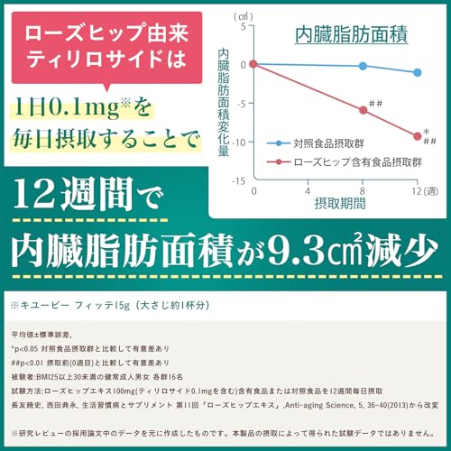 メーカー説明によると、ローズヒップ由来のティロリサイド0.1mgを12週間毎日摂取した場合、内臓脂肪面積が平均9.3c㎡減少したそうです。